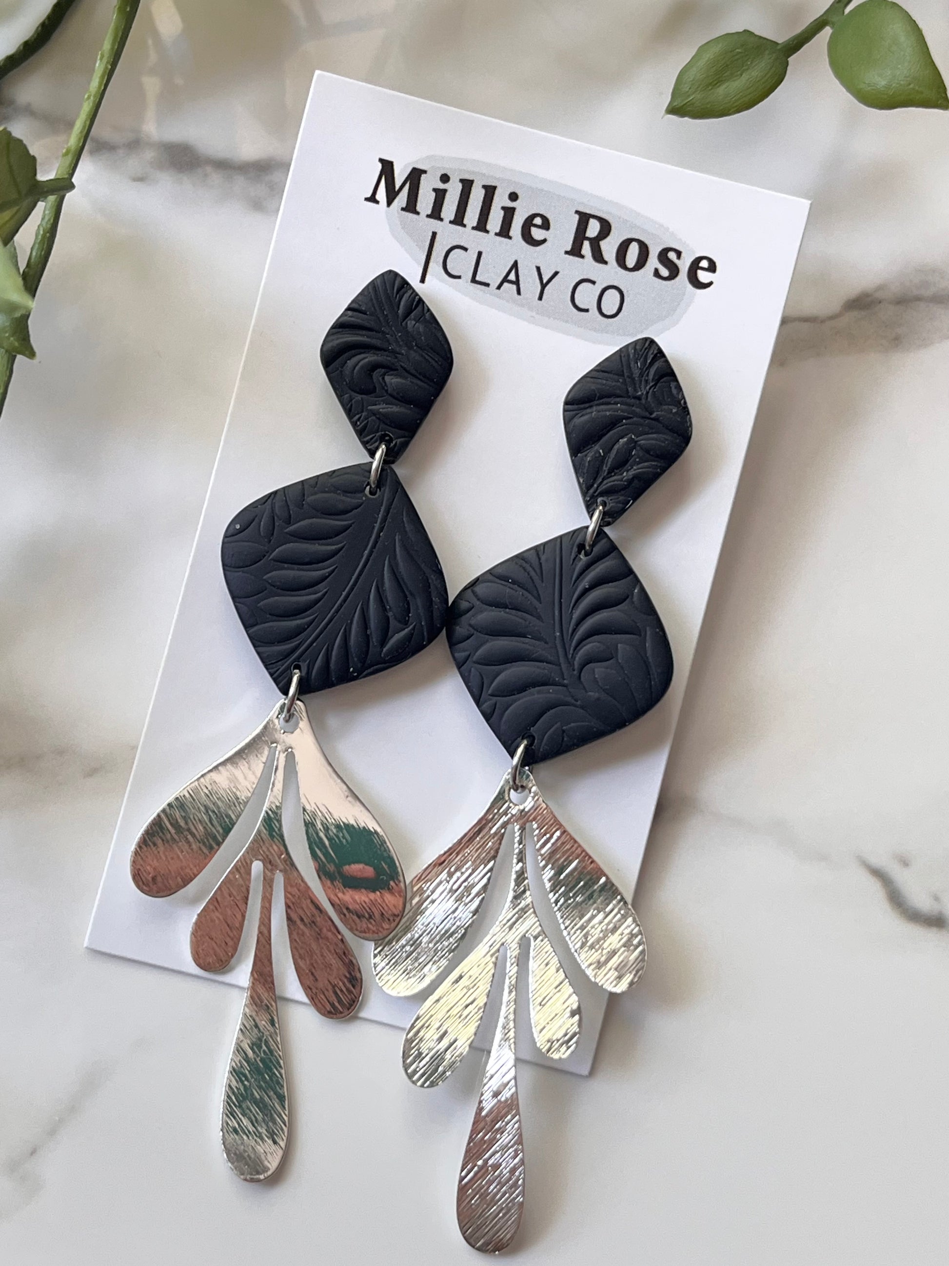 Black Drop Textured Clay Stud Dangle w/ Silver Brass Leaf Charm