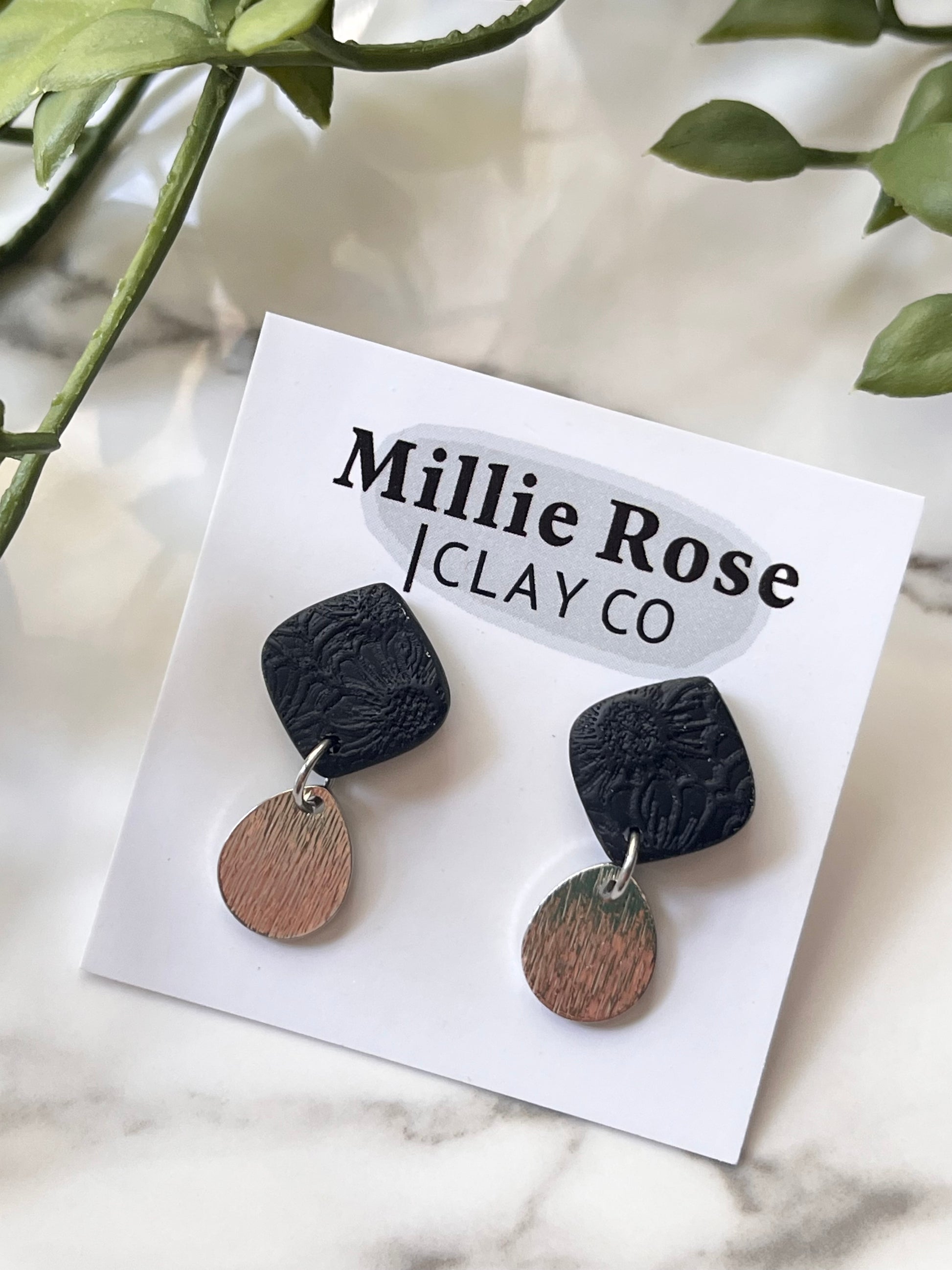 Black Sunflower Textured Mini Diamond Dangle w/ Silver Teardrop Charm