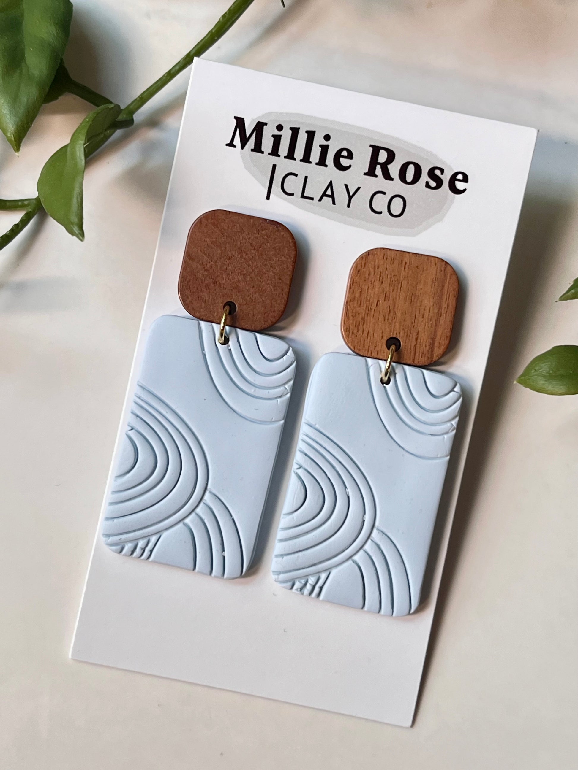 Light Blue Abstract Embossed Rectangle Dangle w/ Wood Square Stud (Gold)